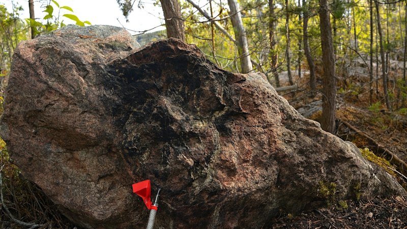 At Reitenbach Lake, geologists discovered a fracture-hosted uraninite outcrop, achieving scintillometer readings as high as 67,540 counts per second (cps). This discovery represents the first identification of primary uranium mineralization on the surface at this site. A notable sample was taken from a steep fracture, where the distinctive blackish-brown uraninite was clearly visible. Nearby, a boulder composed of gneiss exhibited a scintillometer reading of 8,090 cps, suggesting the area may be rich in high-grade uranium.