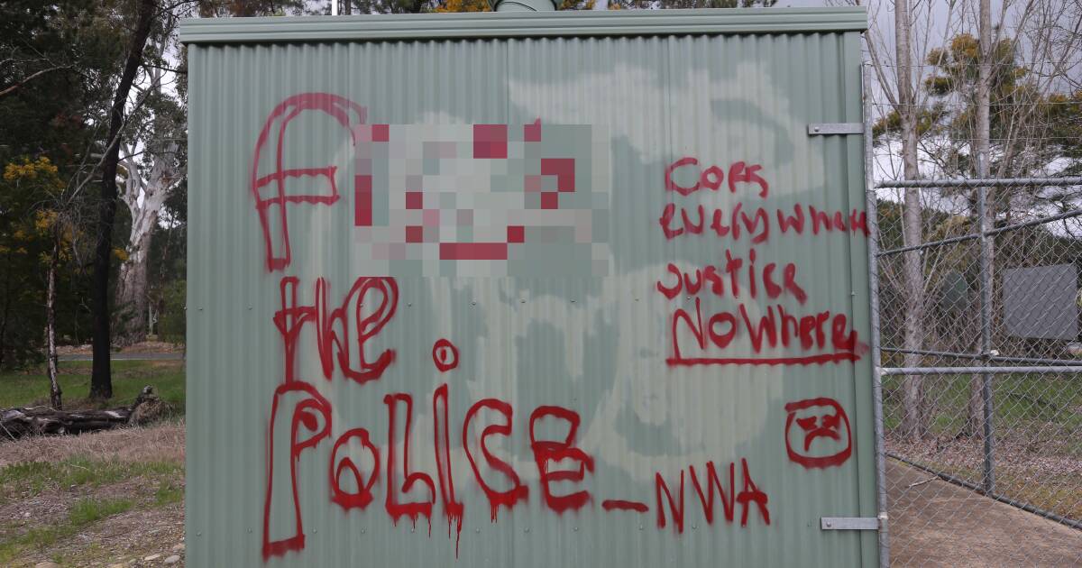 The vandalism, which also includes the phrase “cops everywhere, justice nowhere,” was reported to local authorities earlier today. The defaced shed, identified as part of the town’s dosing plant, is located on Roberts Creek Road near Back Porepunkah Road. This graffiti has emerged against the backdrop of heightened tensions following the shooting on August 26, which resulted in the deaths of Officers Neal Thompson and Vadim De Waart-Hottart.