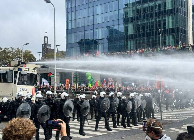 Belgian police deployed tear gas to disperse a large crowd of protesters in Brussels on March 15, 2024, during a demonstration against proposed austerity...